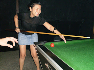 Kekekekz this is how Pool Fool looks like lah..got nothing to do, while the the rest starting to order the booze and check out the bar girls.. so we, decent (heh) girls play some balls lah. kekekz. Oie...Im not that bad ok..I manage to make those balls got into the hole errrmm like.. 5-6 times out of 100 trial shot. Minus the white colored ball ok?